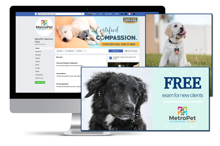 Metropet Veterinary Clinic came to us looking for a consistent way to gain new patients. Due to clients often booking appointments online, we created monthly display ads on Facebook with the incentive to receive a free exam for new patients that book directly through their website.